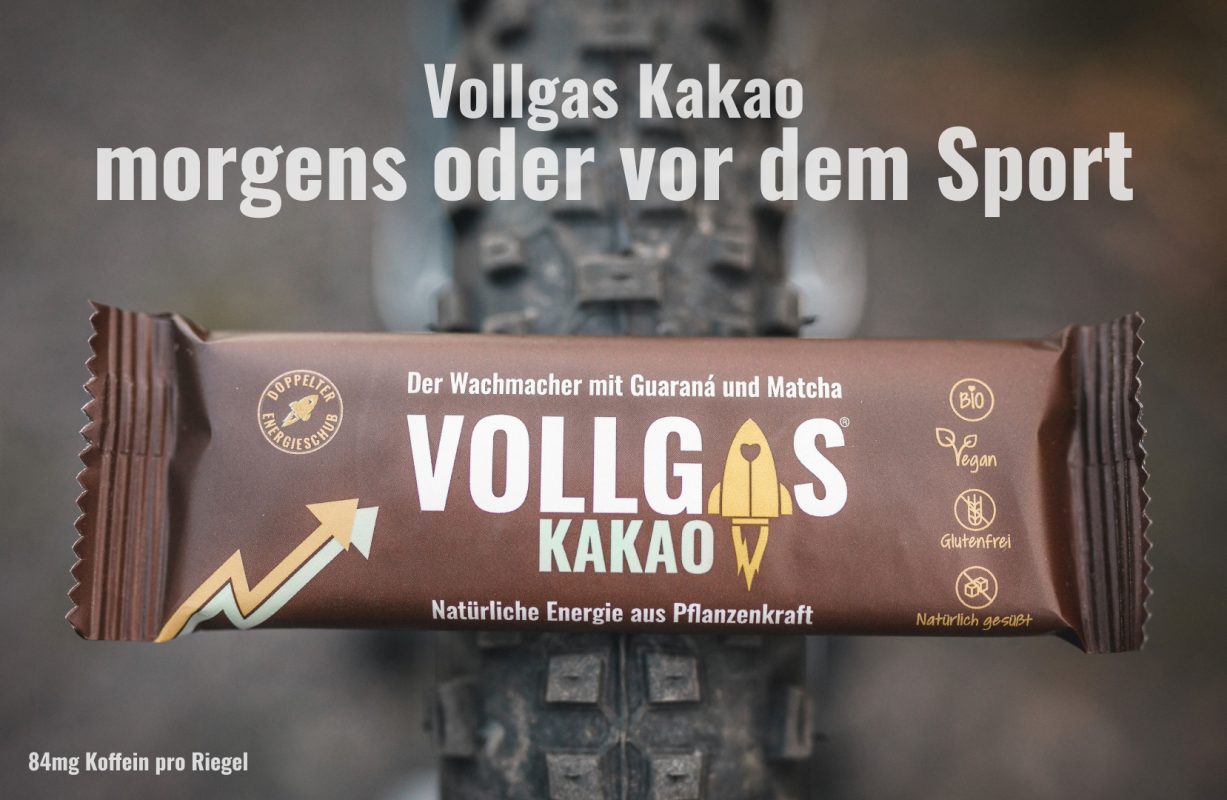 Vor dem Sport isst du am besten einen Vollgas Kakao Riegel. Mit 84mg Koffein enthält er etwa so viel Koffein, wie eine Tasse Kaffee. Er ist dein Superzündi, um so richtig in die Gänge zu kommen. Der hohe Anteil an Kakao hebt zusätzlich die Stimmung. Also Vollgas Kakao einschieben und richtig Gas geben!